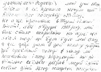 Anastasiia’s father decided to kill the cow, before it is taken away, and sell the meat to buy grain. He sold the meat but, on his way home, he was robbed of the money he made. The robbers also beat him and threw him in the river. He made it home only in the morning and cried at home over the loss of the cow and the money. Shortly after he arrived home, the head of the collective farm Kukharenko and the head of the village council came to the house and took Anastasiia’s father away. Anastasiia never saw him again and never found out what happened to him. Her mother tried to inquire about his fate at the time and went to the oblast centre, Kharkiv. She did not learn anything. Anastasiia writes that Kukharenko is still alive, and that she cries and asks him about the fate of her father every time she sees him, but never gets an answer.