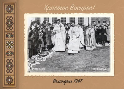 Табір Українських Біженців в Міттенвальді, Німеччина. Свячення пасок на Великдень 1947 року при Українській Католицькій Церкві: парох о.Б. Смик з хрестом, біля нього о. В. Тарнавський, позаду о. М. Кравчук та о. М. Куницький.